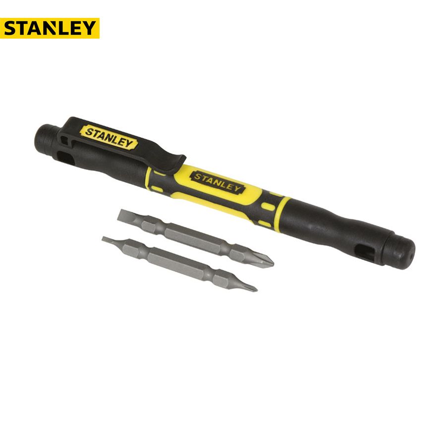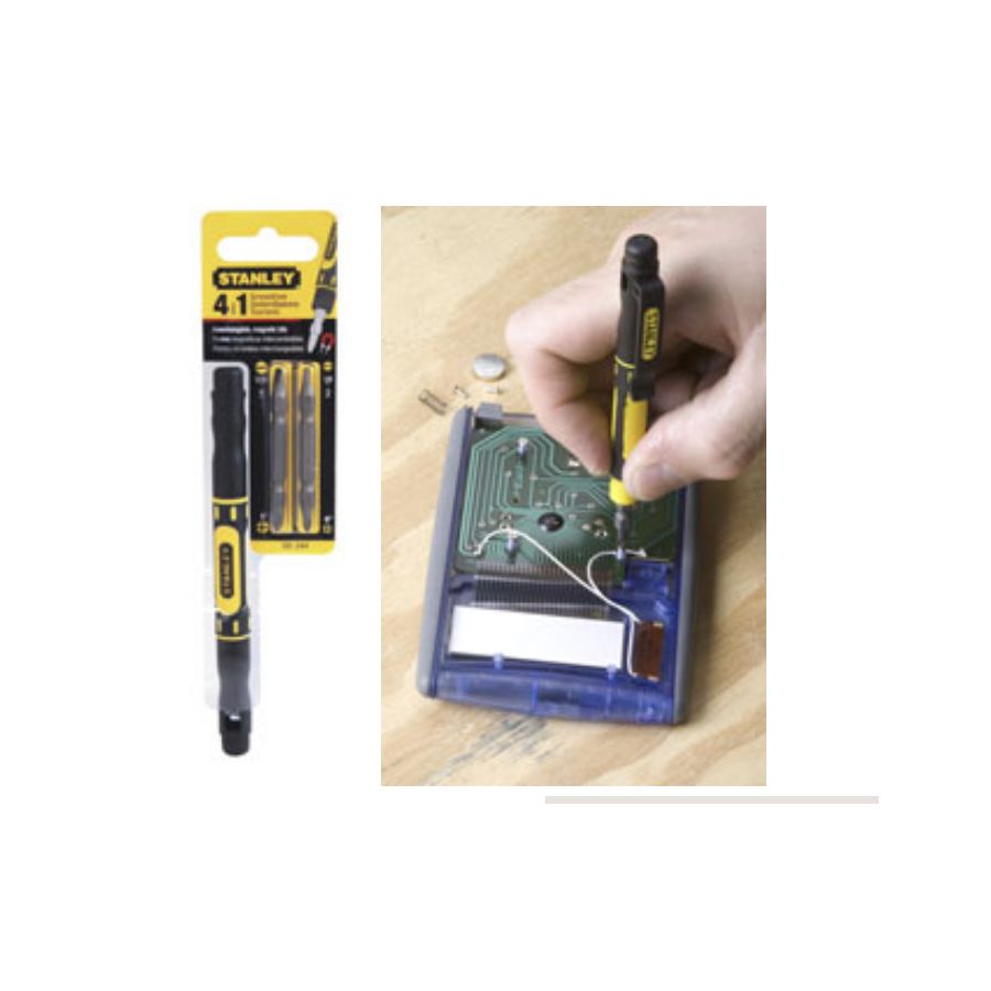 The convenience of a set of precision screwdrivers in one small pocket tool\nThe STANLEY® 66-344 4-in-1 pocket screwdriver comes with two double-ended bit\nIdeal for toy assembly, battery compartments, eye glasses, electronics, and more\nThe magnetic bit have non-slip textured surface so they attract and hold small screws\nAdditionally, the durability of Stanley manufacturing means the tips won't crack, slip or peel\nThe tip sizes are 5/32 in. 1/8 in. 0 pt. and 1pt\nThe pocket screwdriver also has a soft comfortable bi-material grip