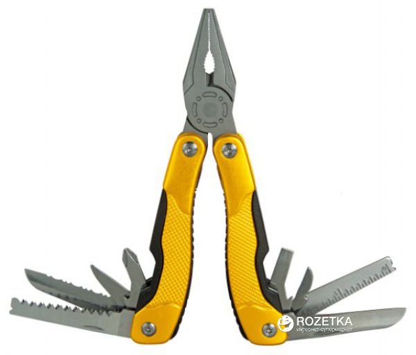 12 Functions: Narrow nose pliers, universal pliers, narrow knife blade, scissors, wood / metal file, wire stripper, Phillips tip screwdriver, snap hook, scale, capsule opener, can opener.